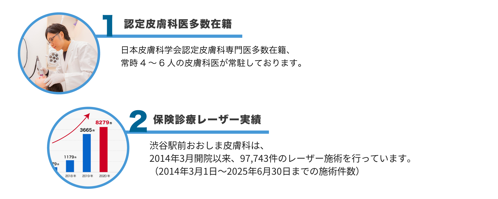 担当する医師が最低限のトレーニングをつんだ厚生労働省の認可した皮膚科もしくは形成外科の専門医であるかどうかは、誰が診察やレーザー治療をするかわからない病院の場合、最低限必ず患者様自身が事前に確認すべき事項と思われます。